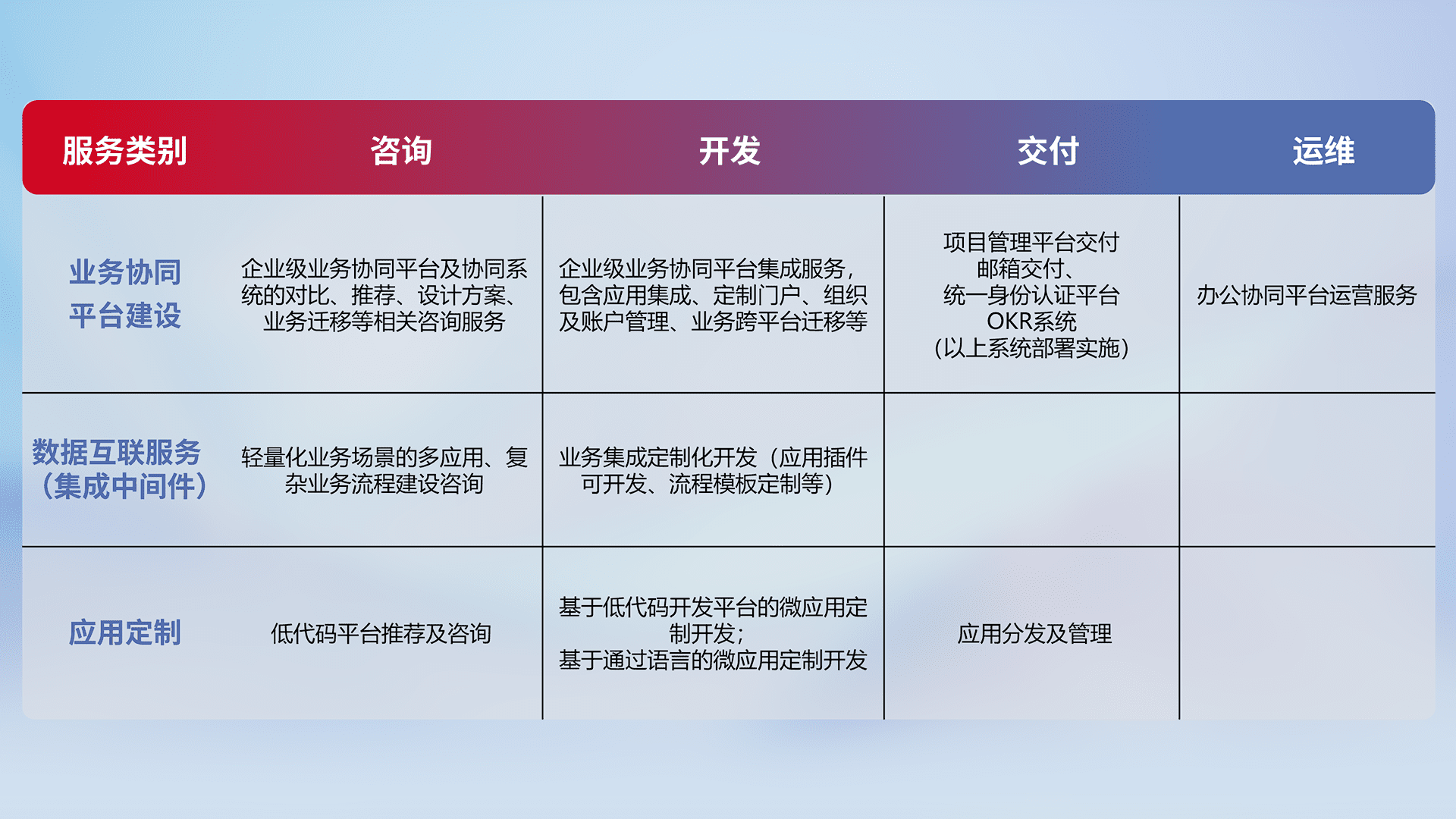 针对钉钉、、、企微、、IDaas等平台级产品提供产品的规划、、、方案、、、交付、、定制化开发等服务,,实现如统一协同办公、、智能客户服务、、、混合会议管理、、智能数据查询、、、、等业务场景,,,实现数字化转型。。。